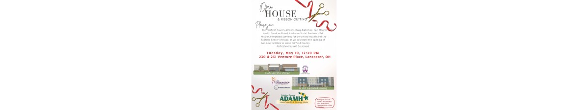Please join the Fairfield County Alcohol, Drug Addiction, and Mental Health Services Board, Lutheran Social Services - Faith Mission, Integrated Services for Behavioral Health and the Fairfield Center of Hope, as they celebrate the opening of two new facilities to serve Fairfield County. Refreshments will be served.